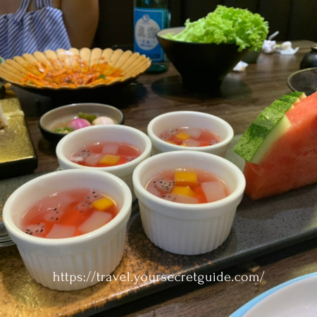 과일사라다·야채샐러드·계란찜·묵은지·오꼬노미야끼·한치무침