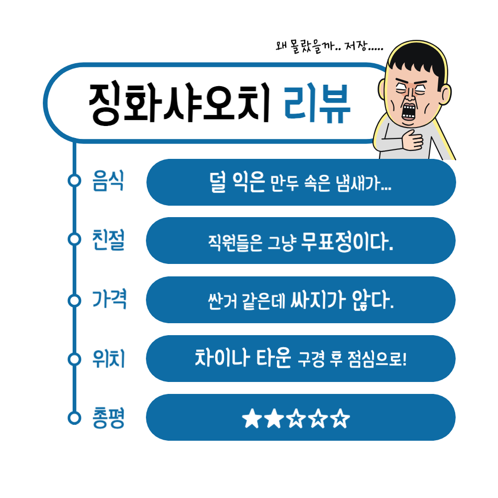 미식가 로파파의 소견은 차이나타운에 와서 만두가 드시고 싶으시다면 징화샤오치를 방문하셔도 좋다고 봅니다. 오직 점심시간 식사용으로는 좋겠습니다. 저녁은 차이나타운에 맛집 '동방미식' 적극 추천드리겠습니다. 아무튼, 한마디 평은 "딘다이펑 가세요."입니다. 맛도 그냥 심심하고 굳이 성시경이 다녀갔다고 너도 나도 가볼 필요는 없겠습니다.