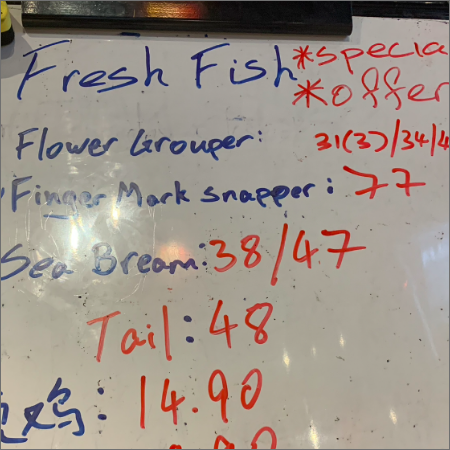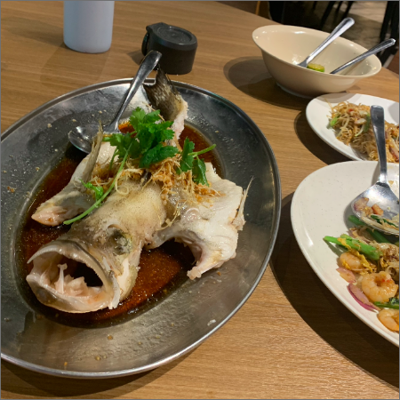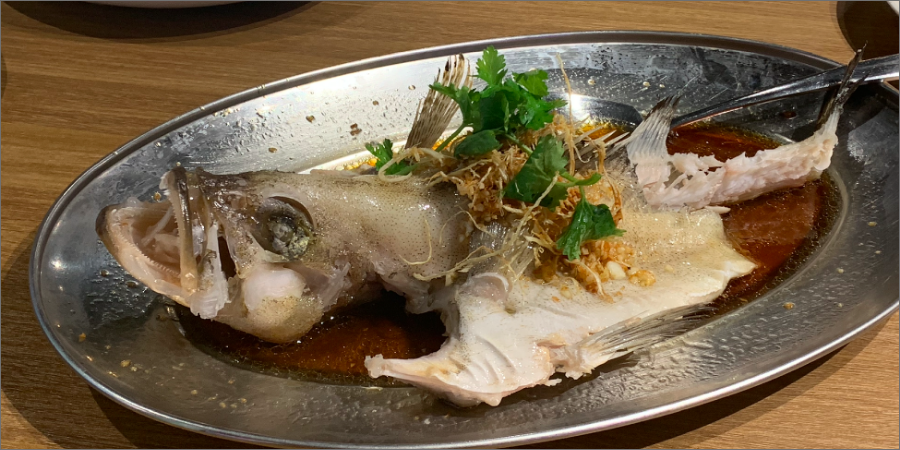 리뷰 : 생선 종류는 참바리(Grouper 그루퍼)이며, 조리 스타일은 여러 가지가 있습니다. 맵게도 하고 카레소스와도 가능하지만 직원의 추천으로 홍콩 스타일로 간장 베이스로 주문했습니다. 정말로 추천드리며, 남녀노소 어르신 아이들 전부 좋아할 정도의 밥 도둑 요리였습니다. 비린내 전혀 없이 즐길 수 있겠습니다.