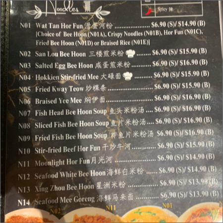 리뷰 : 싱가포르 로컬 음식으로 돼지고기와 야채를 볶아 해산물과 같이 나오는 얇은 면 요리이며, 짭짤한 게 중독성이 강합니다. 저희는 소자 사이즈를 주문하여 2명이서 충분히 즐길 수 있었습니다.