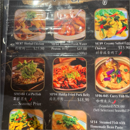 그날그날 시세에 따라 여러 생선들을 선택하실 수 있으며, 여러 가지 싱가포르 & 말레이시아 로컬 음식들을 맛보실 수가 있겠습니다. 직원 이모님에게 추천해달라고 하면 더 편할 수도 있겠습니다.