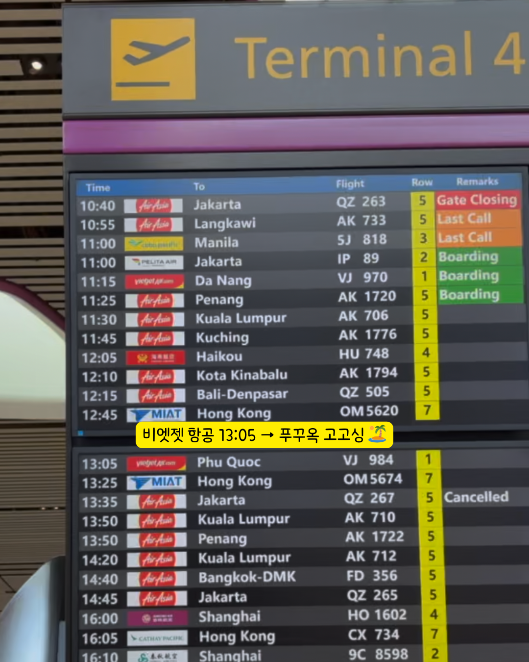 오늘 탑승하는 비행기는 비엣젯 항공, 출발 시각은 오후 1시 5분.