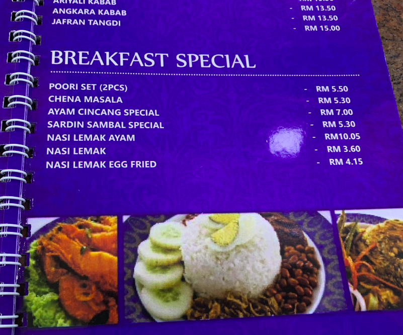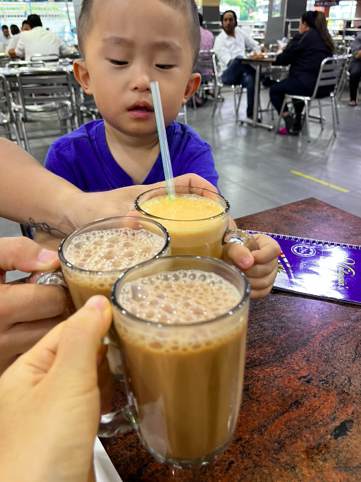 Nasi Kandar Pelita라는 24시간 체인점으로 아침 식사를 하러 갔습니다. 숙소부터 걸어서 5분 정도 거리에 있는 이 식당은 로컬 현지인들 포함 위치적으로 관광객들도 많이 찾아가는 곳입니다. 저희가 시킨 음식들은 ROTI CANAI PLAIN & PLAIN THOSAI & NASI LEMAK AYAM 그리고 TEH TARIK 음료와 로로들은 오렌지주스를 시켜서 먹었습니다. 로로코 패밀리가 먹은 게 굳이 정답은 아니기 때문에(하지만 보편적인 현지 음식이긴 함) 직접 방문하시면 엄청나게 많은 메뉴를 보실 수 있으니, 각자 원하는 음식을 시켜서 드시면 되겠습니다.