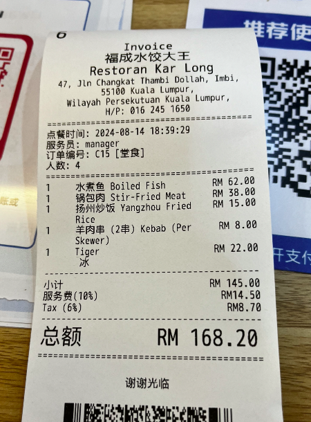 말레이시아 현지 한국 교민들 사이에는 유명하다고 레스토랑 카롱 (Restoran Kar Long)에서 저녁식사를 했습니다. 일반적으로 맛은 괜찮았는데, Boiled Fish (생선 마라탕)는 정말로 강추 메뉴입니다. 생선이 한 마리가 들어가서 양이 너무나도 푸짐했습니다. 싱가포르에서는 생선 살은 조금밖에 없는데, 이 식당에서는 생선 살 양이 너무나 만족했습니다. 맛도 너무나 맛있습니다. 저희가 시킨 음식들 값은 (맥주 1병 포함) 대략 5만 6천 원 정도였습니다. 말레이시아 물가대비 가격은 그다지 싼 편은 아닙니다.